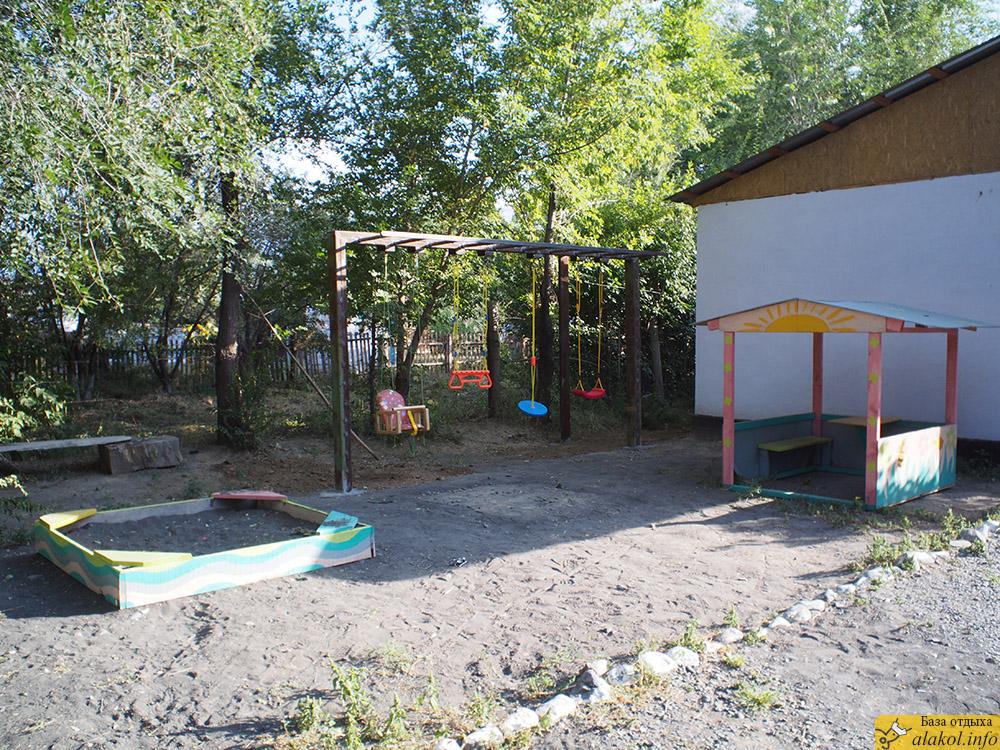 Игровая площадка для детей оснащена качелями для детей разного возраста, песочницей и домиком. Также есть большая качель, лежаки, турник и лесенка по которой ходят руками.